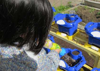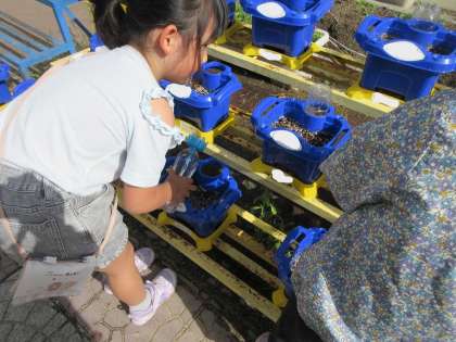 休み時間や通学時は朝顔の水やりを行っています。水やりを忘れず大切に育てている姿が見られます。芽が出てきたので、観察記録を付けながら、きれいな花が咲くようにこれからもみんなで育てていきたいと思います。