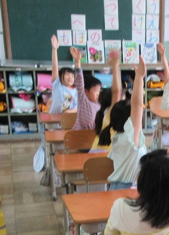 挙手を頑張っている1年生です。真っ直ぐに手を挙げたり、友達の方に体を向けて発表を聞いたりする姿勢を嬉しく思います。