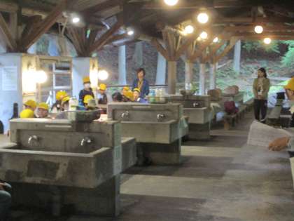 野外炊事の後片付けもてきぱきと終え,炊事場で振り返りを