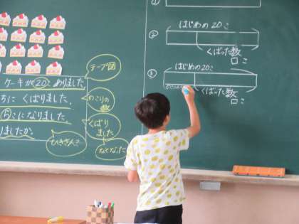 テープ図を使って数量の関係を表す学習をしています。