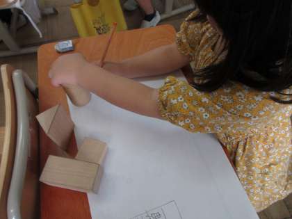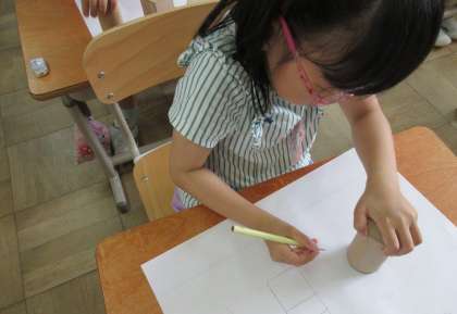 「いろいろなかたち」の学習では、つつの形、はこの形などを写し取って、形を捉える学習をしました。