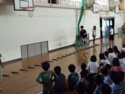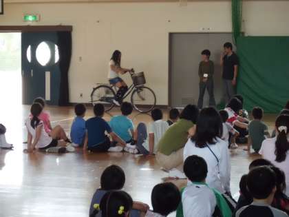 そこで、今日は自転車の乗り方の見本を見てもらうことにしました。6年生の8人、前に出てきてください。この人たちは、先週の土曜日に交通安全子供自転車京都府大会に出場して立派な演技を見せてきました。いまから、その実力を見せてもらいます。