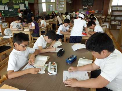 辞書引き大会では,四文字熟語や歴史上の人物名などを,辞書を引きながら調べました。6年生は辞書の引き方が早く,高得点者が多かったそうです。