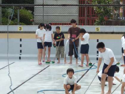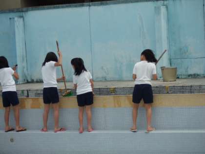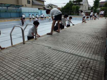 水泳学習に向けて,毎年,5・6年生と教職員がプール清掃を行います。