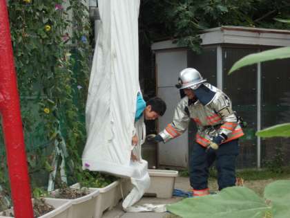 火災の際,一番怖いのは煙です。煙で逃げ遅れた子どもと教員がいると設定して,3階の図書室に設置している脱出シューターを使った救出の様子を見せてもらいました。見事な救出に,子どもたちから拍手が起こりました。