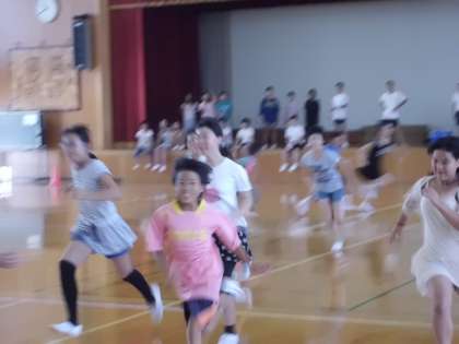 体育館の端から端までを,ゼッケンをつけたオニにタッチされずに往復できたらポイントになります。オニは5年生の運動委員会が受け持ちました。