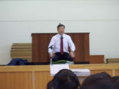 (学校長が座布団を敷いて,即席の高座が出来上がりました。)