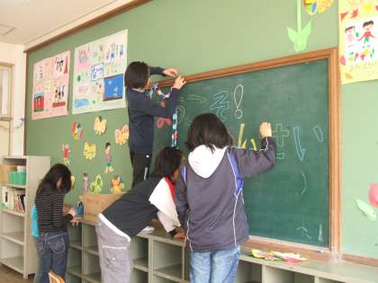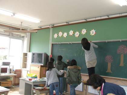 黒板に「入学おめでとう」の絵やメッセージを書いていきます。