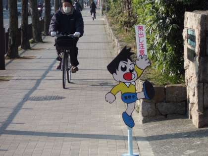 「飛び出し注意」の立て札です。烏丸通りの陸橋辺りは自転車で通る人が多いため,東門から出入りする子どもたちに気をつけてもらえるように立てました。
