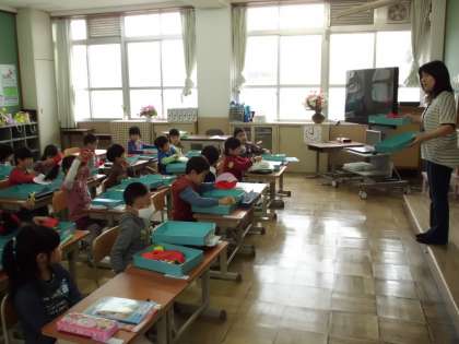 始業のチャイムが鳴る前に,みんな揃ってお道具箱の片づけ方の学習をしていました。