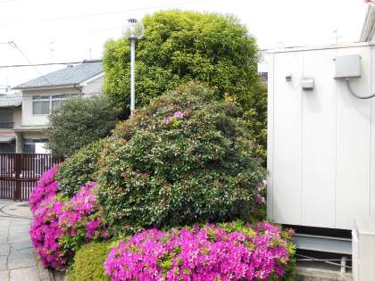 植栽ボランティアでいつも来てくださっている高崎さんに珍しい現象を教えてもらいました。というのは,ツツジの上に別の木があって,その中からツツジの花が咲いているという事なのです。早速見に行きました。写真で分かるでしょうか。