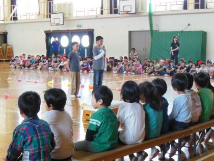 1列に並んで座った1年生に,5年生の計画委員がお迎えのあいさつをしました。