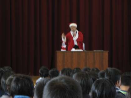 今日は,サンタクロースの話をします。サンタクロースは本当にいるのでしょうか。本当にいたといわれています。今から約1700年前のギリシアという国にニコラウスという人がいました。ニコラウスさんは,困っている人にお金をそっと渡しました。ある時は投げ入れたり,またある時は干してある靴下の中にそっと忍ばせたりしました。 また,こんな伝説もあります。食べ物がなく,みんなが困っているところに,穀物をいっぱい積んだ船が通りかかりました。ニコラウスがその穀物を譲ってもらうことになりました。食べても食べても減らなかったそうです。