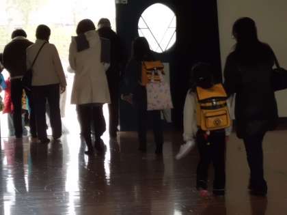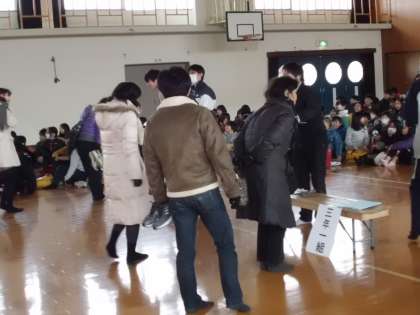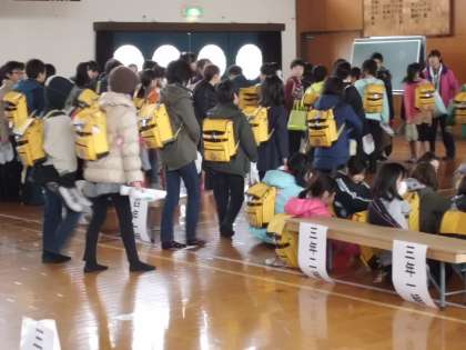 避難の放送が入ると,子どもたちは担任の引率のもと,家に帰る荷物をもって体育館に集まりました。避難後一斉メールによって,保護者の方に周知します。今回は,前もってお知らせしていましたので,既にお迎えに来てもらっている保護者が大勢おられました。担任が引き渡しカードで確認した後,保護者の方に子どもたちを引き渡し,一緒に下校してもらいました。