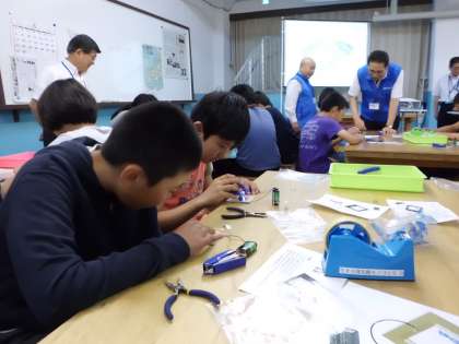 殿堂ブース体験学中に続いて,2時間目は「モノづくり工房体験学習」でした。「タッチから始まる未来」をテーマにして,タッチパネル式のLEDランプを作りました。