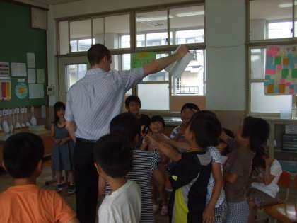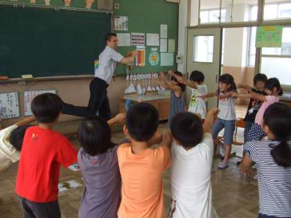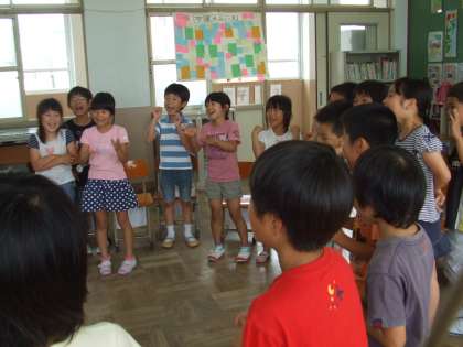 先生が「6月」と書いたカードを持ってみんなの前を回ると,子どもたちは「June!」と元気いっぱい答えました。そして,Andy先生とハイタッチしました。