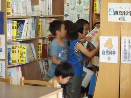 「虫の出てくる本を探しましょう。」図鑑の書架には,たくさんの子どもたちが集まりました。普段から図書室に来ている子どもは,本の置いてある場所をよく知っています。