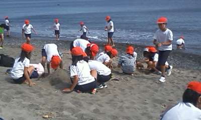 波打際で寄せてくる波に歓声をあげたり,広い砂浜で山や砦を作ったり・・・みんな夢中になって活動しています。何ができたのでしょうか・・・?
