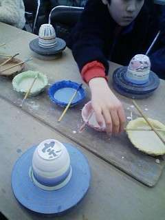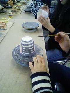 いろいろな色の釉薬が準備されていて,素焼きされた湯呑みに絵や模様をつけます。どんな模様にするかよく考えて,丁寧に絵付けしていきます。写真からしか分かりませんが,なかなか手の込んだ模様を描いているようです。