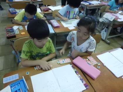 自力解決では,話をしながらブロックを使って計算の順序を確認し,式にしました。計算の順番が分かるよう,印をつけながら計算する子どもの姿が見られました。