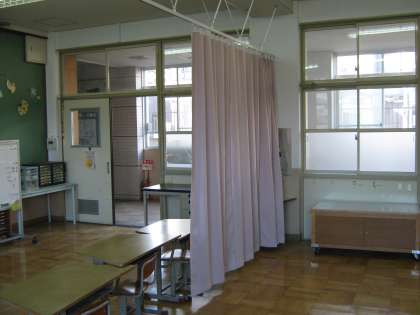 普段は,1つの教室で学習することが多いのですが,分かれて活動するときのために,中央にカーテンを設置しました。