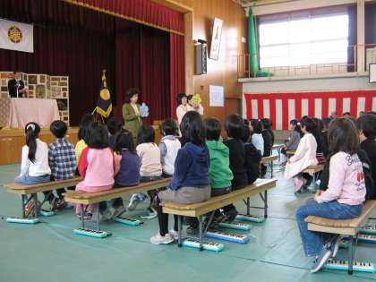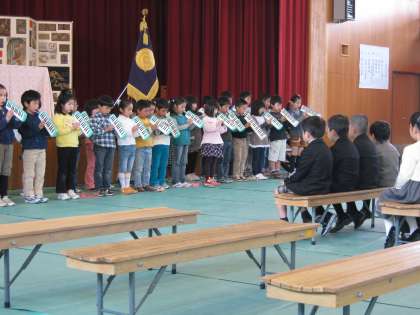 学校長の話の後,担任の先生の紹介がありました。最後に2年生が,お迎えの言葉を言いました。今までの練習を活かして,本番でもしっかり言えました。式が長くなって少し退屈していた1年生も,身を乗り出して聞いています。