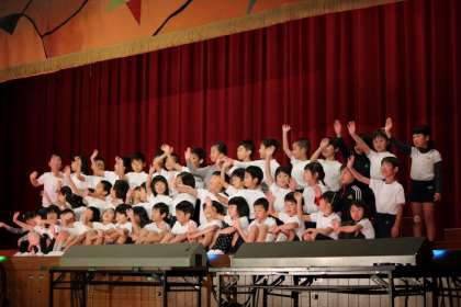 お話は国語で学習した「くじらぐも」へと続きます。くじらぐもに飛び乗った子どもたちは,雲の上から美しい景色やたくさんの建物が見えたようです。楽しい時間を過ごしたみんなは,元気な声で歌を歌いました。そして大きな声で「さようなら!!」緊張しながらも笑顔で頑張った1年生のすてきな発表でした。