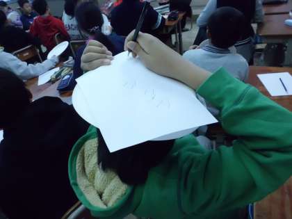 いつものカードもサンタクロースのイラストで行いました。子どもたちは大喜びです。6年生は,頭の上にプレートをのせてその上に紙を置き,サンタクロース,ソリ,トナカイ,プレゼントや家の絵を描きました。思うように描くことができず,出来上がった絵を見せ合ったときには大いに盛り上がっていました。サンタクロースやソリ,トナカイは空にいることや,プレゼントは家の中にあることなど,英語を使って表現しました。