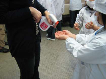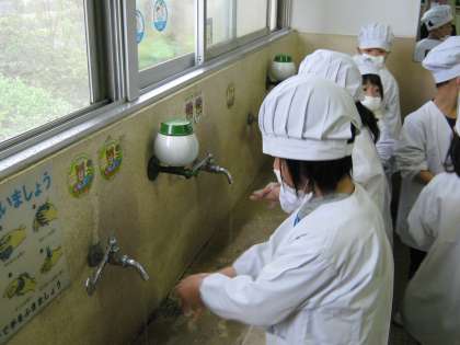 給食当番の服装に着替えた子ども達は,並んで給食室にいきます。「いただきます。」のあいさつの後,手を洗い消毒をします。よい習慣を身につけられるようにするためには,最初が大切です。担任以外にも,養護教諭や教務主任も見守って声をかけるようにしました。