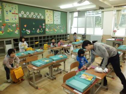 2日目の朝の様子を見に行くと,昨日と違って自分で片づけていました。担任の先生に手伝ってもらいながら,みんなどんどん進めています。「おはようございます。」と元気にあいさつしたり,「今のうちにトイレに行っておこう。」と考えて行動したり,早くできて自由帳に絵を描いて遊んだりする姿も見られました。