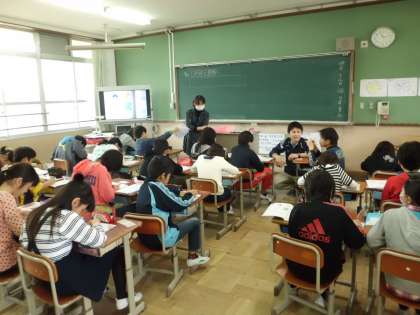 6年生は,算数の学習をしていました。左右対称の図形を見て,その特徴について考えていました。今年度も算数(2時間)と音楽の時間には烏丸中学校の先生に来ていただいて,協力指導の授業を進めていきます。