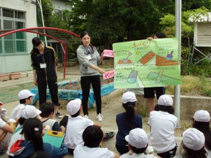 続いて実際に花壇へ行き,田おこしと代かきを行いました。全員で土を混ぜ合わせ肥料を蒔いて耕しました。