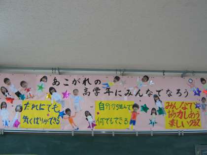 1組は「あこがれの高学年にみんなでなろう」,2組は「成長し合える仲間」です。クラスで話し合ったとき,子ども達は「仲間」や「友だち」ということをとても意識していたそうです。そこに「お互いに高めあえる学級に育てたい」という担任の思いを重ねて,この目標が出来上がったのです。