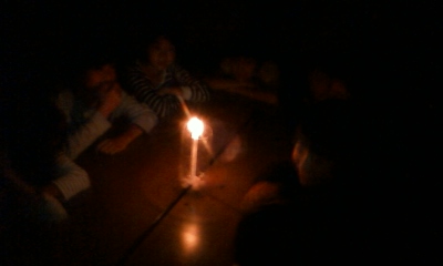 雨のため外ではできなかったボンファイヤーを研修室で行いました。ボンファイヤーは,キャンプファイヤーのように大きな火を囲んで踊ったり,歌ったりするのでなく,ろうそくの炎をグループで囲んで,今日1日の振り返りや語り合いをするものです。どの子も落ち着いた様子で話していました。これからの4泊が有意義なものとなりますように。