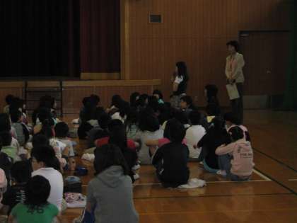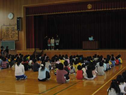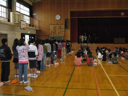 第1回目の室町タイムは,6年生の発表でした。修学旅行での思い出をアンケートの結果発表と作文で,みんなに伝えました。仲間と一緒にいろいろ見物できたこと,自分のお小遣いで記念品を買ったり,帰りを待ってくれている家族や先生にお土産を選んだりしたことなどを話してくれました。発表の後には,数名の子どもたちが発言して感想を言いました。