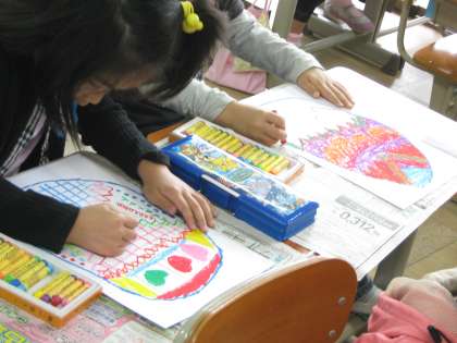 そこで,今日はたまごの殻の絵を描きました。クレパスの色をたくさん使って,模様を工夫しています。力を入れて隙間なく描き込んだ子どももいました。みんながんばってカラフルなたまごが出来上がったようです。