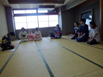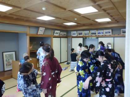PTA教養委員会の主催で「浴衣を着て楽しく茶道体験をしよう!」の体験会がありました。PTA茶道部さんの協力で,手持ちの浴衣を着付けてもらいました。子ども用は貸し出しもありました。普段着慣れない衣装ですが,皆さん背筋を伸ばして美しい姿です。とても似合っておられました。