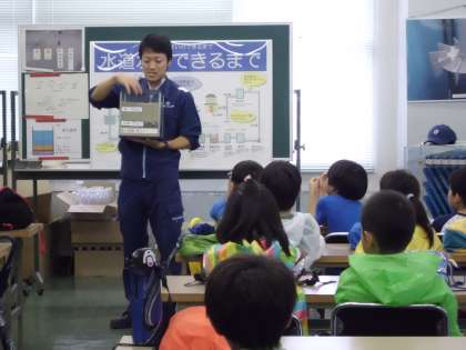 4年生は社会科の学習で水の学習をしています。みんなが毎日使っている水は琵琶湖から来ていることを知りました。でも,琵琶湖の水はにおいがするし,にごっているのにどうしているのだろうという疑問から,浄水場というところで水をきれいにしていることを知りました。