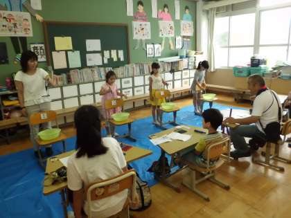 大空学級のお店は「連続シャボン玉とばし大会」です。輪に液をたっぷりつけて,シャボン玉を何個も何個も作っていきました。多い人は50個以上も連続で作ったようです。
