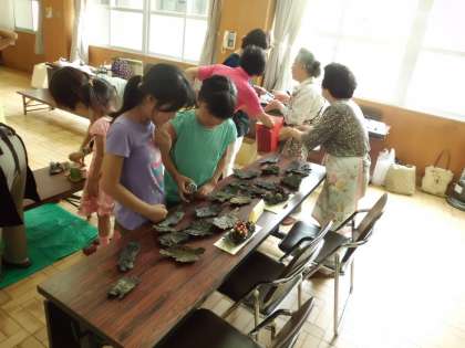 用意してくださったまつぼっくりや木の皮,枯れ枝や木の実を組み合わせて作りました。材料選びも大切です。可愛い布の珠や切りぬいた目の形を上手く使って作る子どももいました。普段外遊びの大好きな子どもたちもが夢中になっているのを見ると,微笑ましいですね。