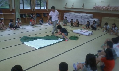 オリエンテーションで布団とシーツの敷き方たたみ方を教えてもらいました。1日目はバンガローで寝ます。