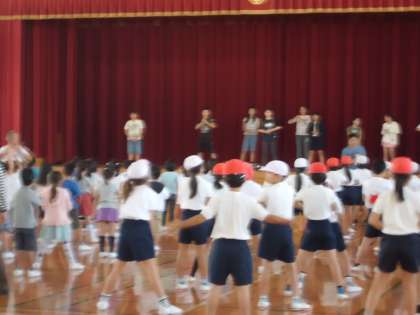 中間休みに運動会の全校ダンスの練習をしました。1日目は低学年。舞台上で踊る高学年の真似をしながら一生懸命踊りました。曲名は「EXダンス体操」です。