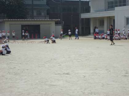 1・2年生が合同でバラエティ走の練習をしていました。ちょうど1年生が走る時でした。すると2年生がコースの周りにいて,やり方を教えてあげたり用具を戻してあげたりアドバイスをしたりしていました。とても頼もしく思いました。