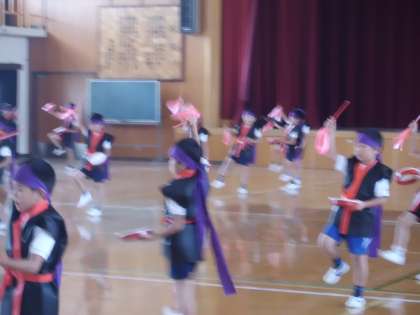 2年生の団体演技は,沖縄の踊り「エイサー」です。子どもたちは法被を着て太鼓を持って踊ります。写真は体育館での練習ですが,今日は運動場いっぱいに広がって踊っていました。さわやかな秋空に2年生の子どもたちの元気な掛け声と太鼓の音が響いていました。本番が楽しみです。