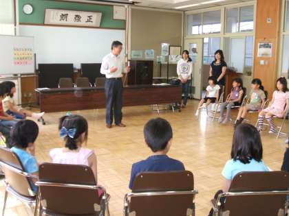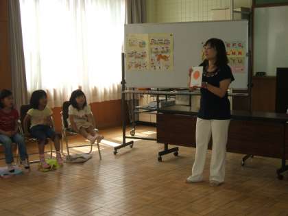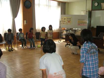 最初に校長先生の挨拶があり,さっそく英語を歌いながら踊ったり,