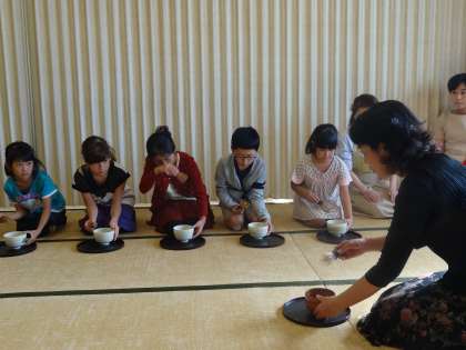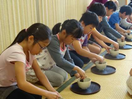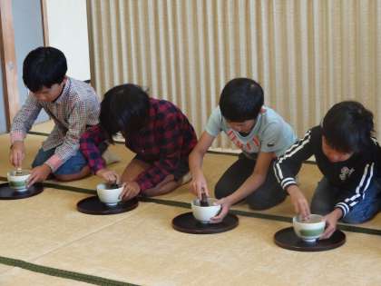 いよいよ茶せんでお茶を点てます。半数位の子どもたちが一度は点てたことがあるそうです。手首を使ってカシャカシャと・・みんな真剣な表情で,最後は「の」の字を書くようにして茶せんを戻しました。上手く点てられたようです。