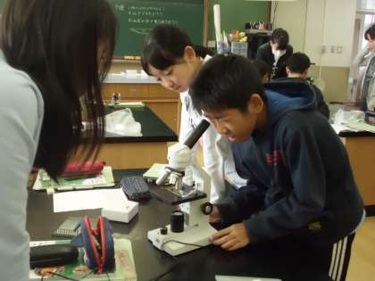 噴火した山から出た火山灰を見せてもらいました。一般的な灰との違いを顕微鏡で確かめてみると,火山灰の中から水晶やトパーズが見つかりました。「わあーきれい!」「キラキラ光ってる!!」と歓声が上がりました。実物に触れ,大きさ,手触りを実感していました。