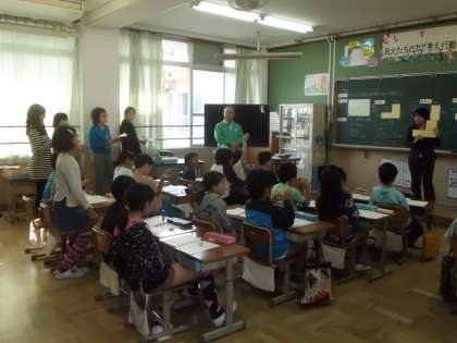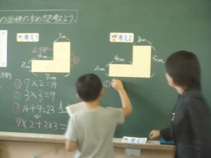 集団解決の場です。分けて考えたり,付け足してから引いたりして考えたりと考え方を話し合いました。式を書きながら説明したり,友だちの考えに付け加えたりして考えを深めていきました。「一つの式にまとめて考えられます。」と発言する子どももいました。