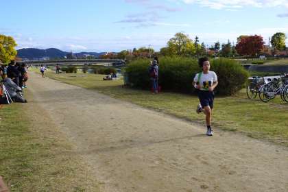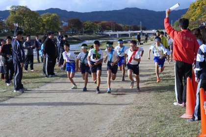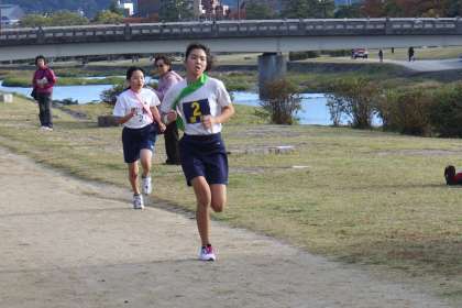 駅伝のレースが始まりました。緑のタスキを胸に最初の走者が走りました。第2,第3走者につなぎます。