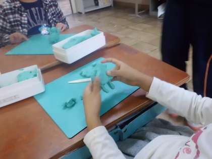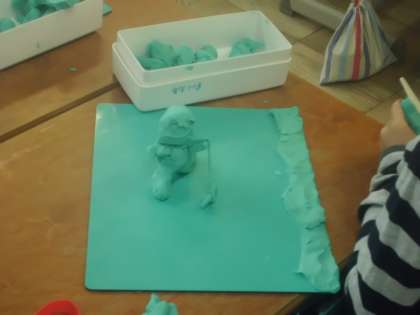 「見て!髪の毛うまくできた〜!!」と嬉しそうに自分の作った人を見せる子,へらを上手に使って髪の毛や目や口など細かな所まで表現する子,一緒に散歩する友だちや犬を作る子・・グループの子どもたち同士で見せ合いながらどんどん工夫していました。